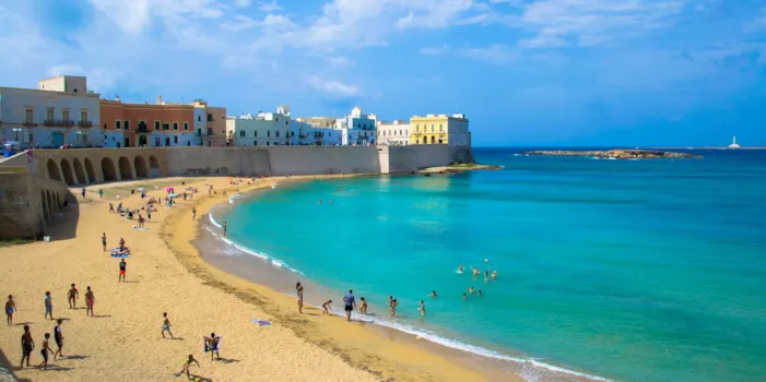 Per la bellezza del territorio, dei panorami ma anche per i servizi pensati per tutti, questa regione, detta anche il "tallone dello stivale" è una destinazione campeggio ideale per le proprie vacanze in famiglia. I paesaggi sono variegati e talvolta selvaggi: spiagge di sabbia fine si alternano a insenature e a una costa rocciosa con promontori vertiginosi. Tutti i campeggi si trovano sugli 800 km di costa. I paesaggi più spettacolari della costa del sud-est dell'Italia presentano scogliere frastagliate, colline verdeggianti che si tuffano in un mare cristallino. Godetevi questo splendore direttamente dalla vostra piazzola per caravan o dal vostro bungalow vista mare in uno dei campeggi in Puglia, magari a Gallipoli, considerata la perla del mar Ionio oltre che per le sue spiagge e i suoi lidi attrezzati, anche per la sua bellezza architettonica. Scopri il suo centro storico, perditi per le sue viuzze e ammira lo stile barocco nei suoi dettagli.