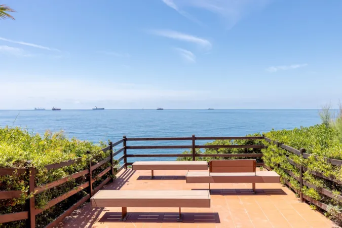 Kampeerplaatsen met zeezicht (ca. 20), met houten terras, tafel, stoelen, parasol en ligstoelen.
